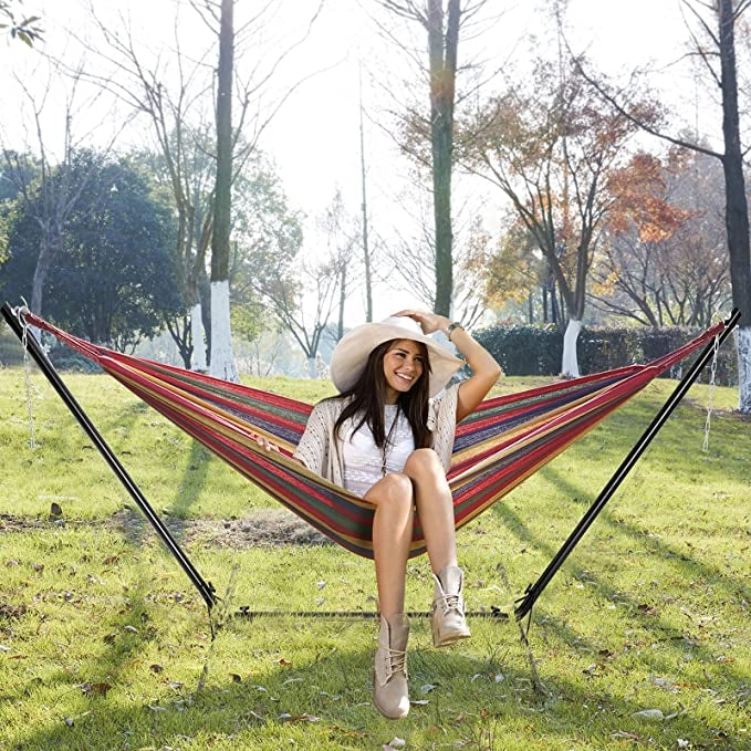 È ideale per vari tipi di amache, Realizzato con la struttura in acciaio resistente, questo supporto è robusto e durevole, offre uno spazio sicuro e stabile e dura a lungo. Essendo portatile, puoi portarlo con te quando vai in campeggio o quando viaggi.