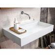 Lavandino sospeso (o da appoggio ) in Solid Surface ad alte prestazioni. Dotato di vasca contenitore con coperchio mobile e lungo copri piletta sul piano di scarico inclinato della vasca incassata nel piano. La speciale piletta traforata garantisce un deflusso ottimale ed un filtraggio sicuro, mentre il coperchio della vaschetta contenitore diventa una base di appoggio mobile da poter posizionare a piacimento. Staffe, viti e Fisher standard in dotazione nella versione sospesa e di kit di pulizia e ripristino in entrambe. Il rubinetto è posizionabile in ogni punto del top ed il foro di installazione è fattibile in opera.