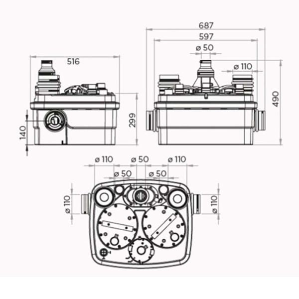 Sanicubic 2 Classic contiene due pompe bilanciate con carico separato con sistemi di macerazione ad alte prestazioni e funzionerà alternativamente. In caso di sovraccarico di afflusso, entrambi i motori funzionano contemporaneamente o nell'improbabile caso in cui un motore si guasta, l'altro subentra.