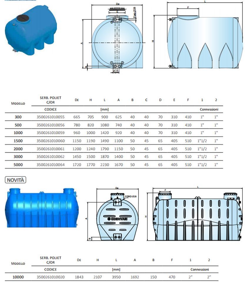 SERBATOIO IN POLIETILENE RACCOLTA ACQUA CORDIVARI CILINDRICO ORIZZONTALE 1000 LITRI
