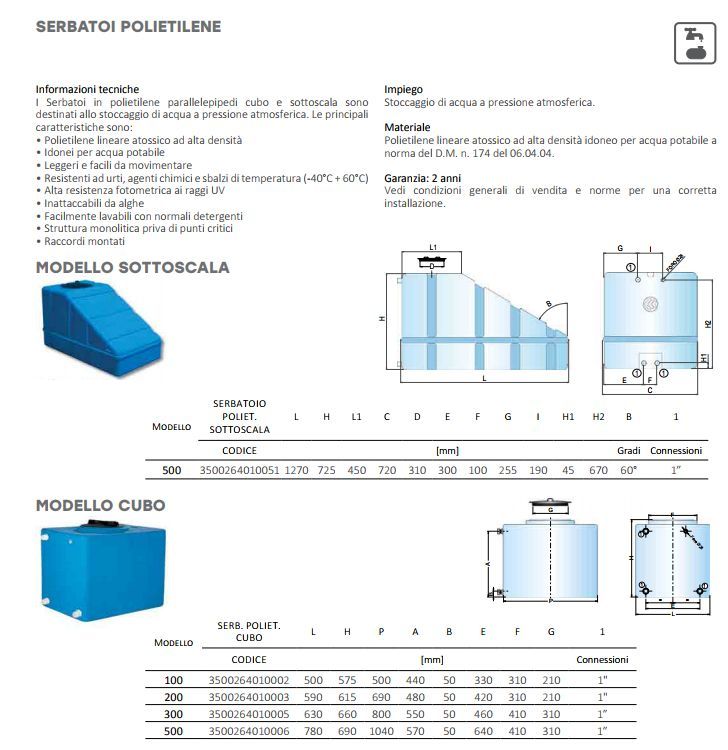 I serbatoi in polietilene parallelepipedi cubo e sottoscala sono destinati allo stoccaggio di acqua a pressione atmosferica. le principali caratteristiche sono:
