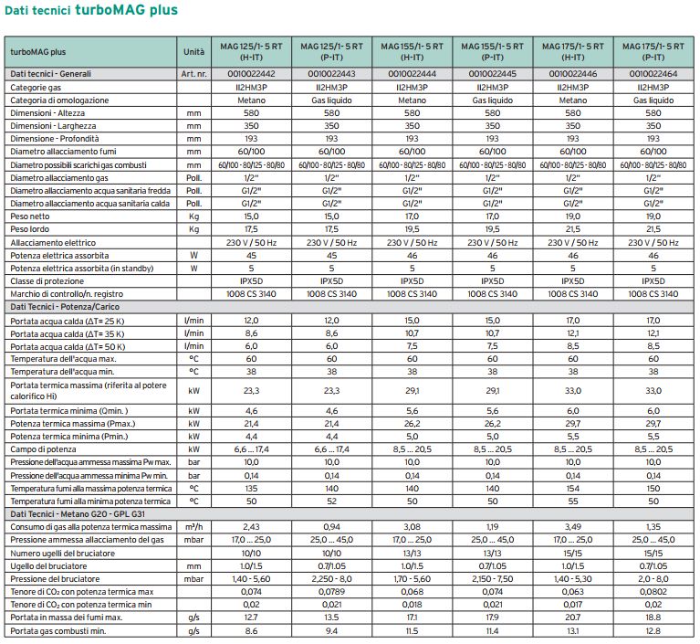 L’offerta di turboMAG plus è molto flessibile e copre le seguenti portate di produzione ACS: 12, 15 e 17 litri/minuto con modelli a Metano e a Propano Commerciale.